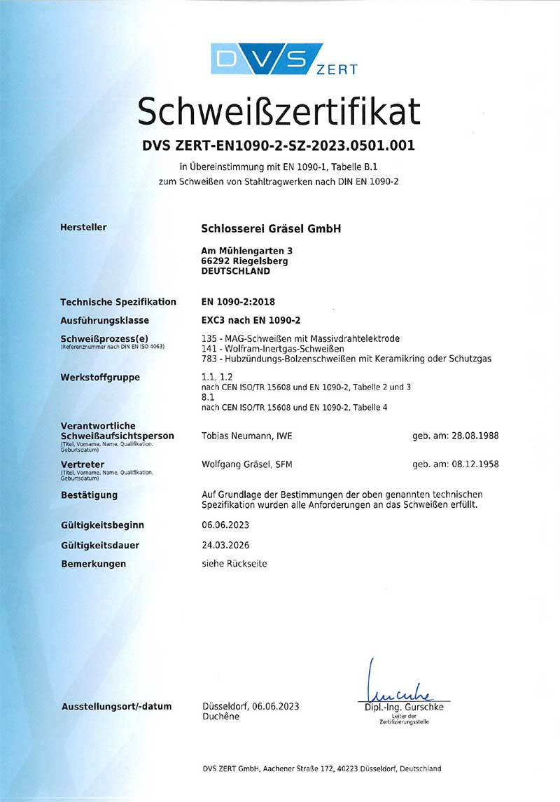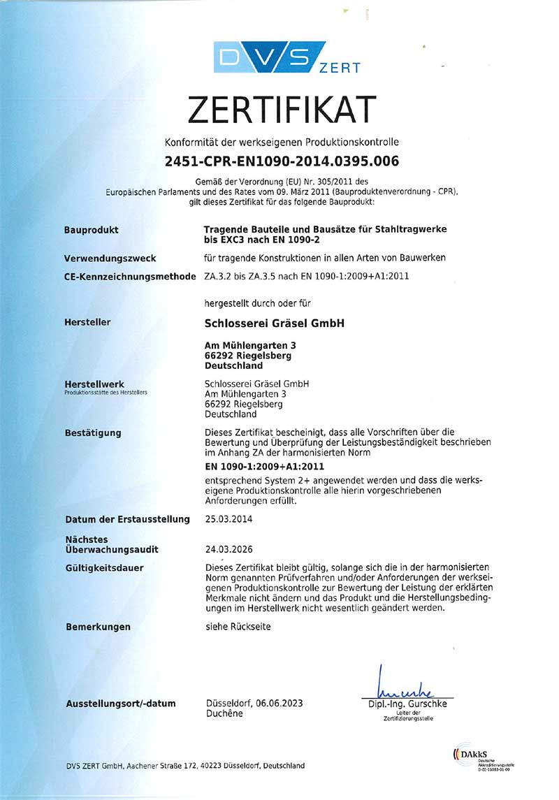 Schweißzertifikat EXC 3 nach EN 1090-2